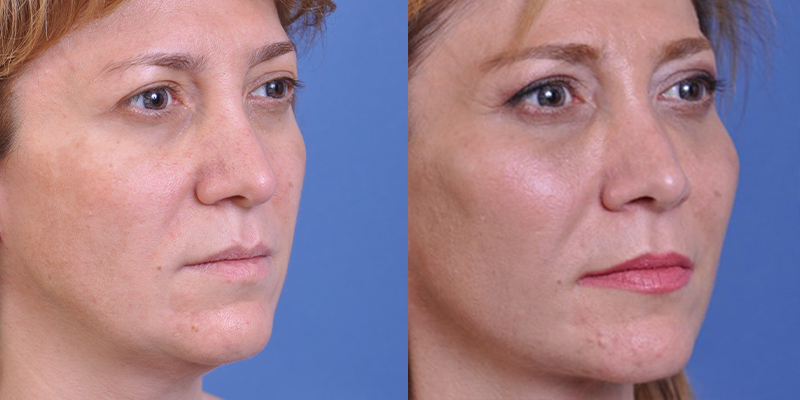 This patient had Malar Augmentation via placement of Cheek Implants, Lower Facelift, and Neck Lift with Submental Neck Liposuction.